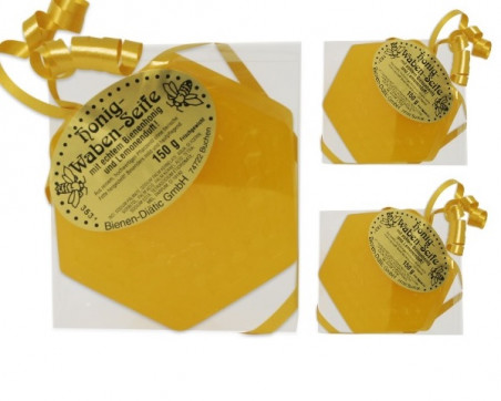 Honig Lemon Wabenseife in einem Klarsicht-Geschenkkarton mit Dekoband.