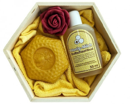L'ensemble contient également un luxueux savon en nid d'abeille au lait de miel (100 g) qui nettoie et hydrate votre peau en douceur. La texture crémeuse et le miel naturel confèrent au savon une touche particulière et assurent une sensation de peau douce et soyeuse.