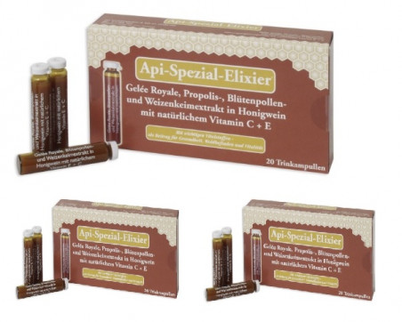 Ampułki do picia z mleczkiem pszczelim, propolisem, pyłkiem pszczelim i ekstraktem z kiełków pszenicy w winie miodowym z naturalną witaminą C + E